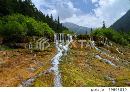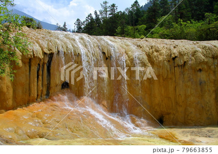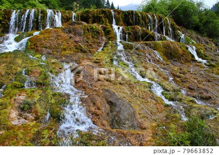 中国四川省アバ・チベット族チャン族自治州松潘県 世界自然遺産黄龍風景区の滝と水の流れ