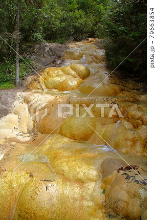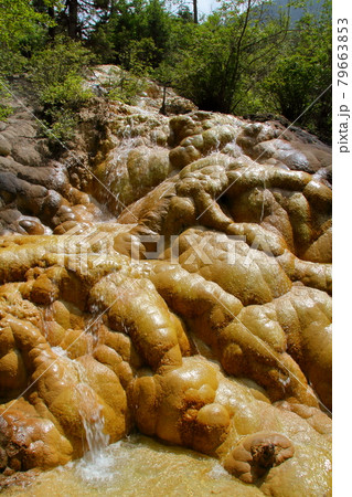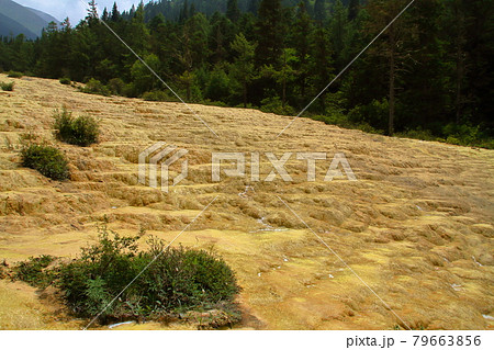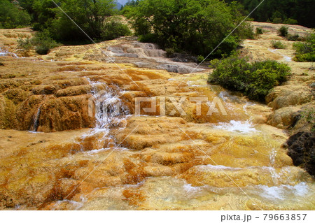 中国四川省アバ・チベット族チャン族自治州松潘県 世界自然遺産黄龍風景区の斜面を流れる水の流れ