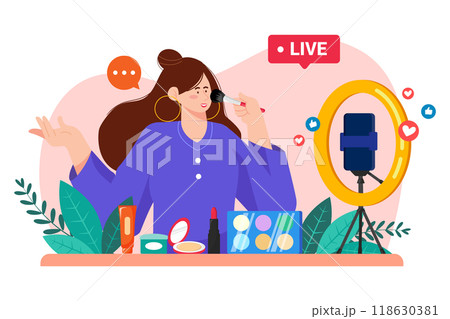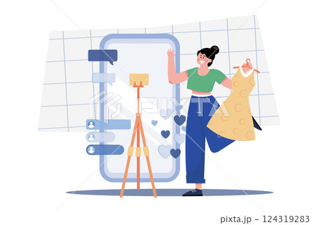 Influencer girl broadcasting live video at home. Women selling clothes online