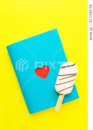 Blue notebook with red heart and popsicle on yellow. Saint Valentine`s day.