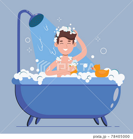 Man in shower cap taking bath with the shower. Happy funny guy in bubble bathtub, relaxing with yellow duck and washcloth. Bathtub with steam on a white background. Flat cartoon vector illustration