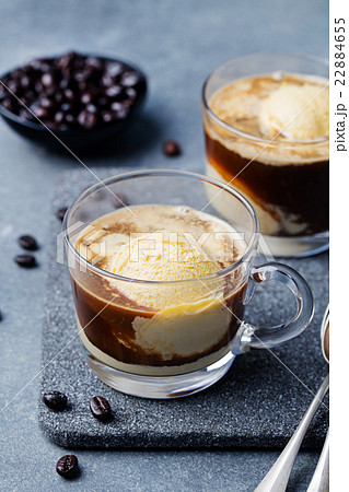 Affogato with Ice Cream, coffee glass with whipped cream and syrop, bright background