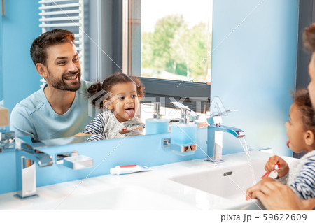 Mixed Race Family. Father and daughter brushing teeth together showing tongue at mirror playful