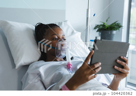 African american female patient with oxygen mask, lying on bed and using tablet in hospital room