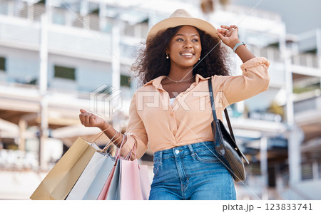 Shopping, fashion and city black woman with bag after retail therapy spree, sales discount or buying shop clothes. Boutique product, store shopping mall and happy customer with luxury designer gift