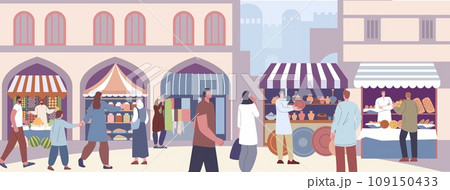 City market scene, asian or arab street marketplace. Oriental mood, vendors at counters and citizens. Shopping on boulevard kicky vector urban concept
