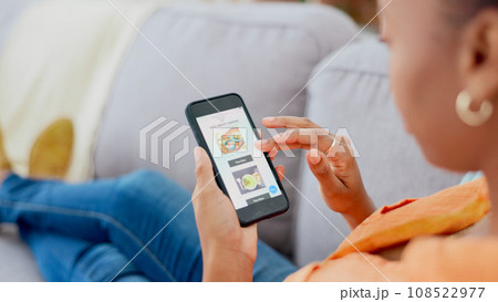 Food delivery, search or phone with hands of black woman on sofa for online shopping on internet. Scroll, screen or African customer browsing on technology ux at home for offer, app menu or choice