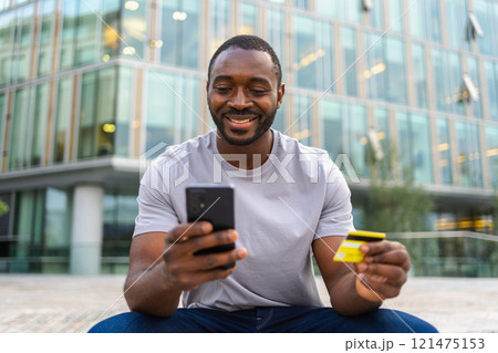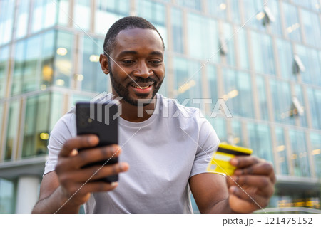African American man shopping online holding smartphone paying with gold credit card Guy on urban street in city buying on Internet enter credit card details Online shopping ecommerce delivery service