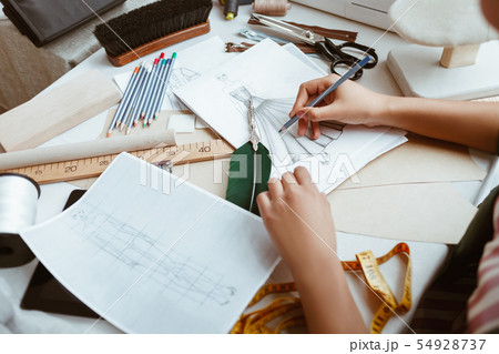 Top view of fabulous young tailor in design studio. Drawing new layout