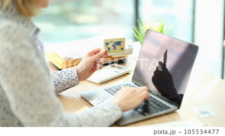 Happy young African American woman sitting at the desk in the office, holding a credit card in her hands and looking at the laptop monitor screen with joy.