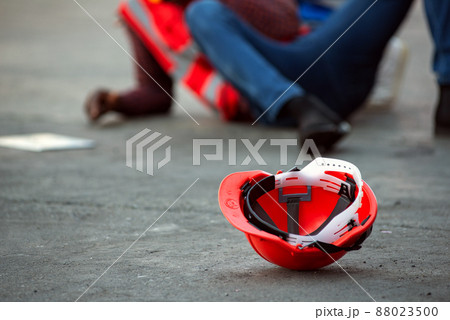 Red hard safety helmet hat for engineer on concrete ground with African-American male engineers injured the accident from working blurred image background.