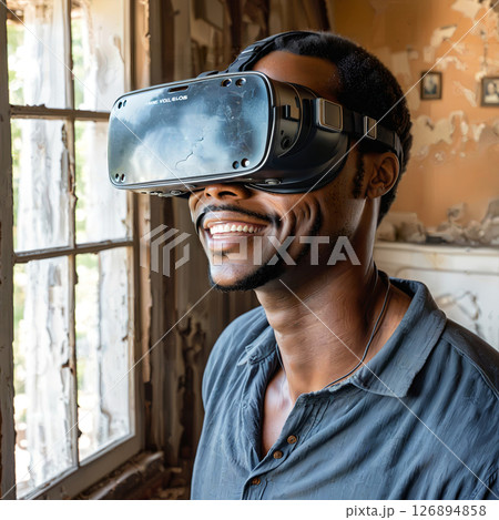 荒廃した部屋でVRを通して喜びを体験する男性