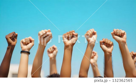 Several hands are clenched into fists and raised above the head against the background of the blue sky