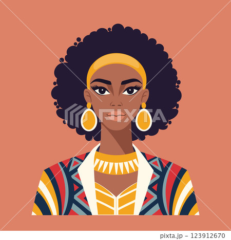 Beautiful African American woman with afro hairstyle and colorful clothes. Portrait of elegant African woman. Flat style illustration.