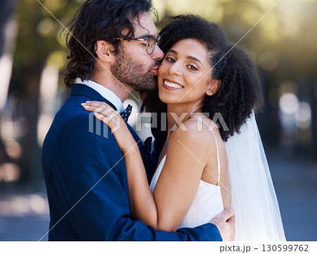 Wedding bride and groom kiss portrait at romantic outdoor marriage event celebration together. Partnership, commitment and trust embrace of interracial people with excited and happy smile with bokeh