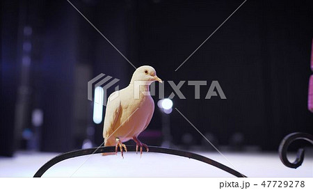 Trained white dove sitting on a magician's stick. Circus White Pigeon