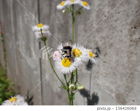 紫のアザミの花にやってきた、ホソヒラタアブ