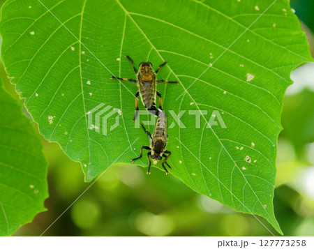 葉の上で観察した、ムシヒキアブ科シオヤアブの交尾行動