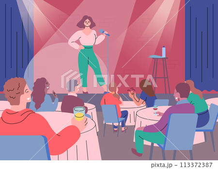 Cartoon Color Characters People and Comedian at Open Mic Concept Flat Design Style. Vector illustration of Standup Comedy Show