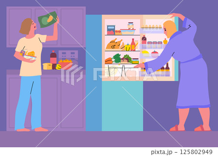 Cartoon Color Characters Guy at Refrigerator and Girl eats Chips Night Snack Concept Flat Design Style. Vector illustration of Late Night Snacking