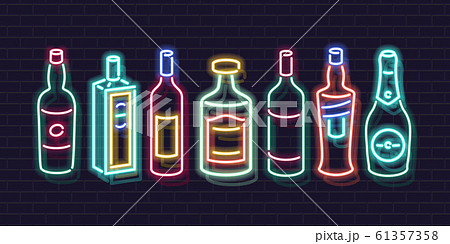 Neon bar shelf bottles icon set. Beverages for