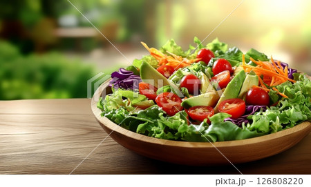 白背景に木のボウルに入ったコブサラダの水彩イラスト