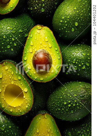Avocado with drops of water on it and whole avocado next to it. Generative AI