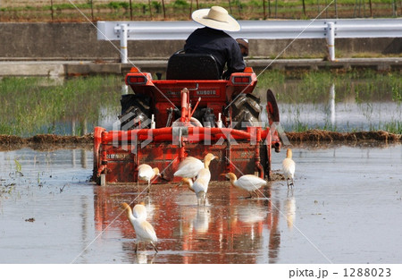 アマサギ トラクターで掘り起こした土の中の餌に集まる。