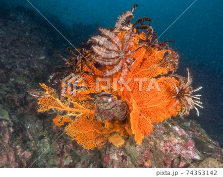 濁った珊瑚礁のウミウチワとウミシダ (メルギー諸島、ミャンマー)