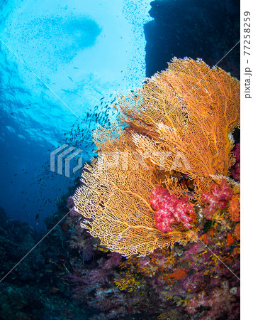 ウミウチワと色とりどりの珊瑚 (リチェリューロック、スリン海洋国立公園、タイ王国)