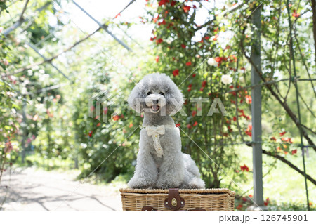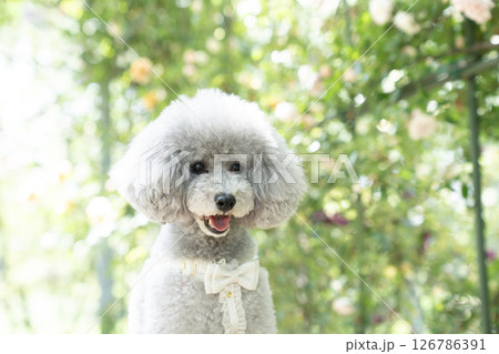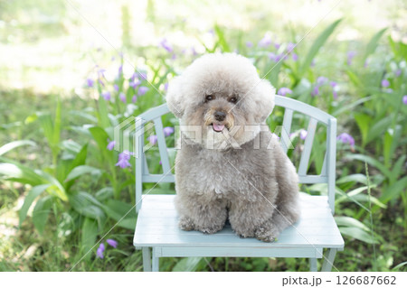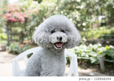 椅子にのって笑うトイプードルのアムルのバストアップ