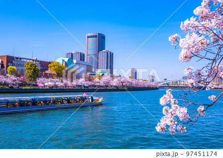 大阪市北区天満橋 桜宮公園から見る大川と大阪アメニティパーク
