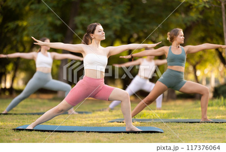 Slim women practicing yoga - virabhadrasana pose in summer park