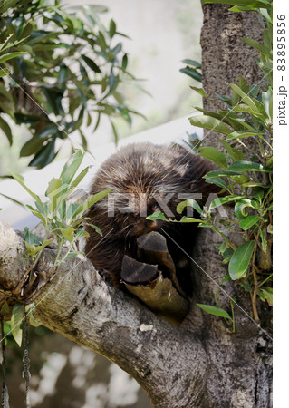 木の上で昼寝するカナダヤマアラシ