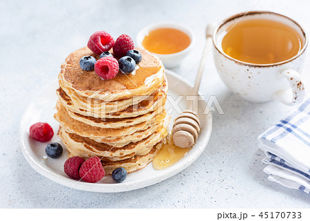 Stack of healthy oat pancakes with berries, honey and cup of green tea