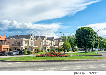 Row of nice residential townhouses with private entrance from the street