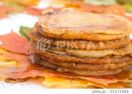 pancakes with maple syrup on autumn leaves