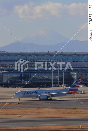 富士山を背景に誘導路を走るジェット機 旅客機 羽田空港から見る富士山