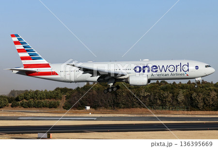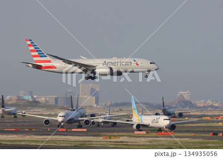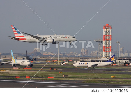 羽田空港に着陸するアメリカン航空機