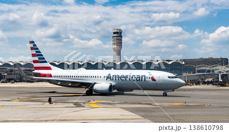 Washington DC, USA - June 04, 2024: Plane arrival American airline. American aviation airline. American airline plane departure in airport. Airport terminal and runway strip. Aviation. Arrival gate