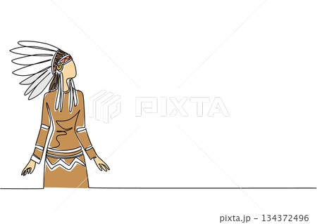 Continuous line drawing of a Native American woman in traditional dress and feathered headdress, expressing cultural heritage concept for American Indian Citizenship Day in a history and pride theme.