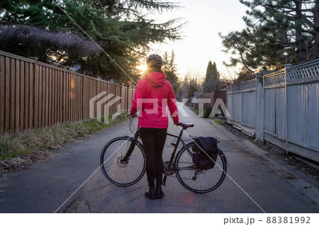 Adventurous Woman Standing with a bicycle at an Alleyway in Modery City Suburbs