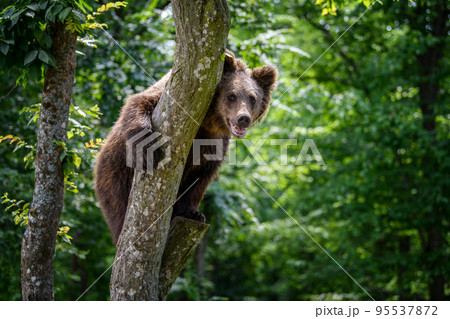 Wild Brown Bear (Ursus Arctos) in the summer forest on tree. Animal in natural habitat