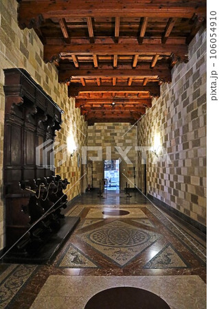 ロドス島、騎士団長の宮殿、松笠モザイクの通路と椅子