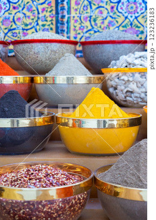 Traditional spices market. Pots and wooden tubs stand in row with colorful tea, spices, fruits, roots, flowers. Street bazaar. Dubai, UAE. Vertical photo