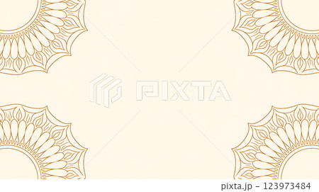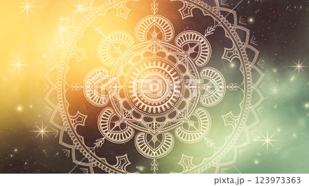 創輝漸變背景上的圓形曼陀羅.有花卉圖案的曼陀羅。柔和的瑜珈模板。與圓形曼陀羅的漸層背景。