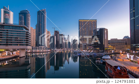 Dubai Marina towers and canal in Dubai night to day timelapse