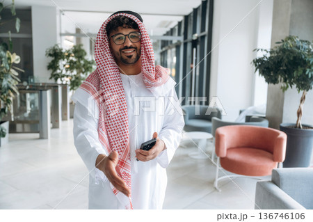 One continuous line of Arab man holding mobile phone for banner, poster, and greeting card.