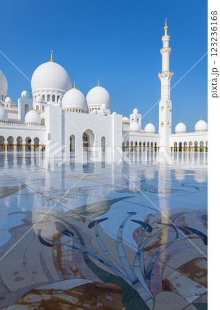 View of Sheikh Zayed Grand Mosque in Abu Dhabi made of snow-white marble with flowers made of precious stones in design and beautiful reflections. Vertical photo
