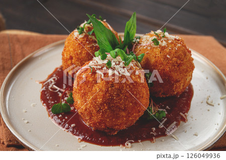 Delicious deep fried arancini rice balls being served on tomato sauce with herbs